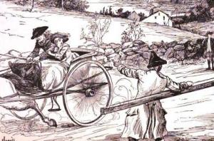 It’s too long to fully recount here, but the gist of it is something like this: Austin wrote about a fictitious traveler named Dunwell. On a stage coach trip from Providence to Boston, Dunwell, sitting next to the driver because there was no room in the coach, encountered something he never forgot. A violent storm approached on the horizon and the driver cautioned him to prepare himself for a drenching…the “storm-breeder” was nearby. Soon enough a wild-looking man driving an open chaise raced past them. In the chaise with him was a terrified young girl. As soon as they had gone, the storm broke upon them. Dunwell asked the driver if he knew the man. The driver responded, “By many a wet jacket do I remember him. I suppose the poor fellow suffers much himself. Much more than is known to the world. Let him be where he may, he will tell you he cannot stay a moment, for he must reach Boston that night.”