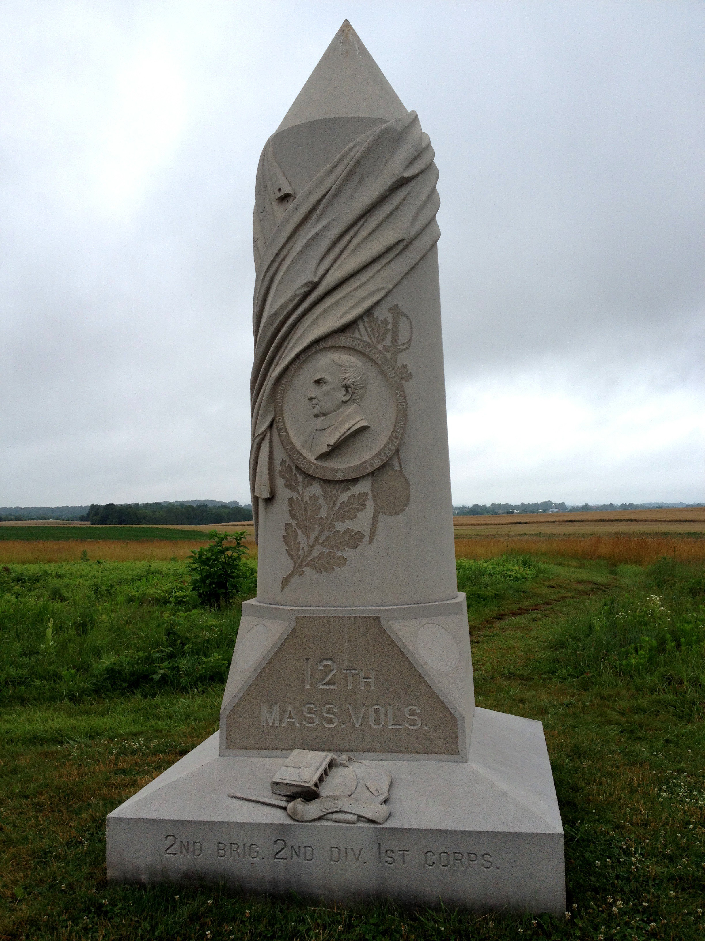 During the Battle of Gettysburg, the 12th Massachusetts belonged to 2nd Brigade (Baxter), 2nd Division (Robinson) of the I Corps (Reynolds). It was known as “Webster’s Regiment” after their first colonel, Fletcher Webster, the only surviving son of the late Senator and famed orator Daniel Webster.